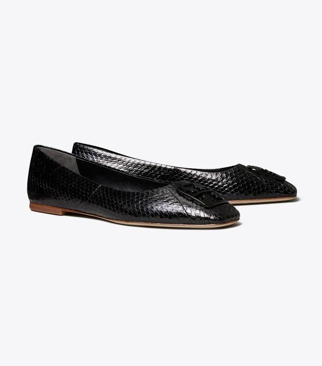 A square toe and square hardware meet luxurious snakeskin. Our new Georgia Ballet Flat plays with tonal texture, desi... A square toe and square hardware meet luxurious snakeskin. Our new Georgia Ballet Flat plays with tonal texture, designed with a flattering high vamp and a cushioned insole. It comes in several colors, including Olive, available only at Tory Burch Websites.