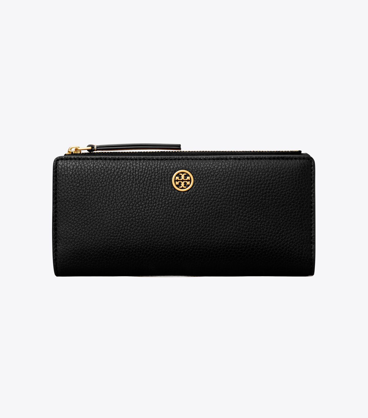 A collection named for Tory's parents, Buddy and Reva Robinson. Inspired by their love of travel, the timeless, versa... A collection named for Tory's parents, Buddy and Reva Robinson. Inspired by their love of travel, the timeless, versatile silhouettes are designed for everyday use. Our Robinson Zip Slim Wallet opens to multiple pockets. Made of soft pebbled leather, the long shape fits full-length bills without folding.